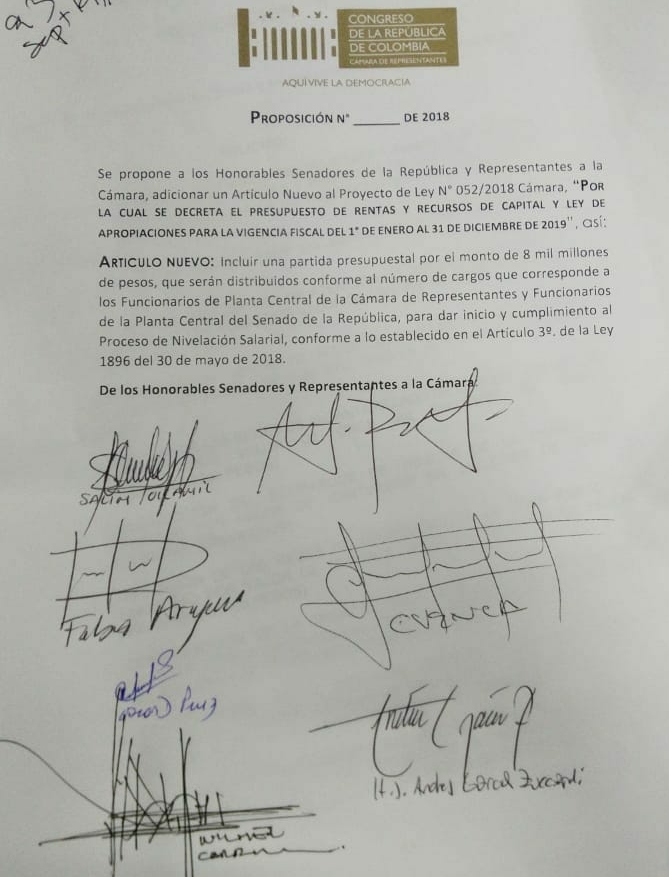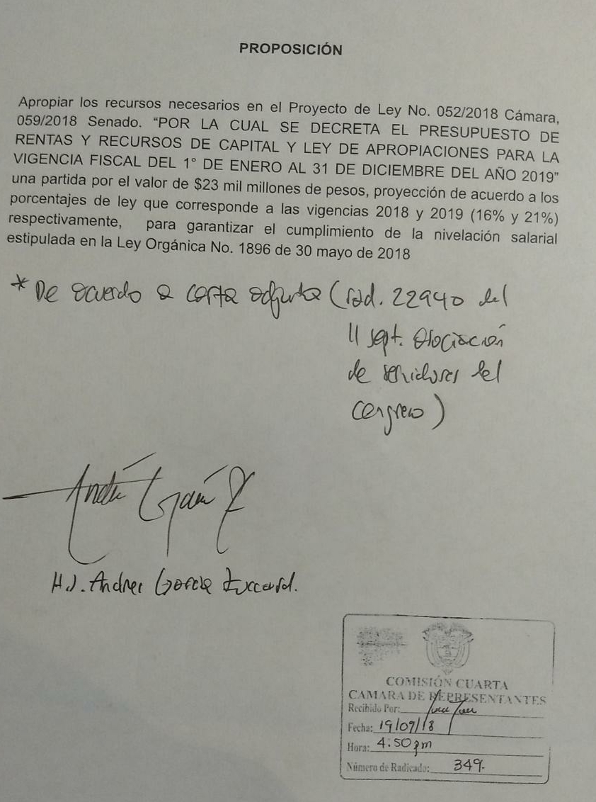 En el debate del Presupuesto Nacional, el Senador y miembro del Partido de la Unidad, Andrés García Zuccardi y muchos congresistas lucharon por que se incluyera en el presupuesto un aumento de al menos 10% al salario de funcionarios de planta cobijados por el plan de nivelación (Ley 1896 de 2018). El aumento se aplicaría a partir del primero de enero de 2019.